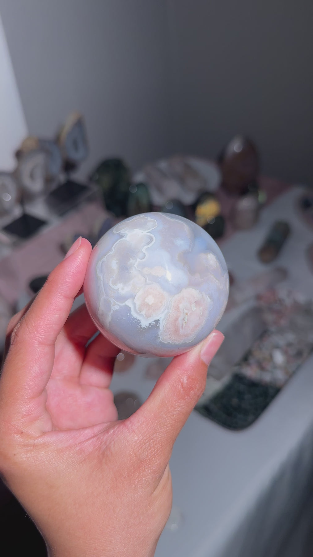 Pastel Baby Blue w/ Pink Plumes Flower Agate Sphere - 40